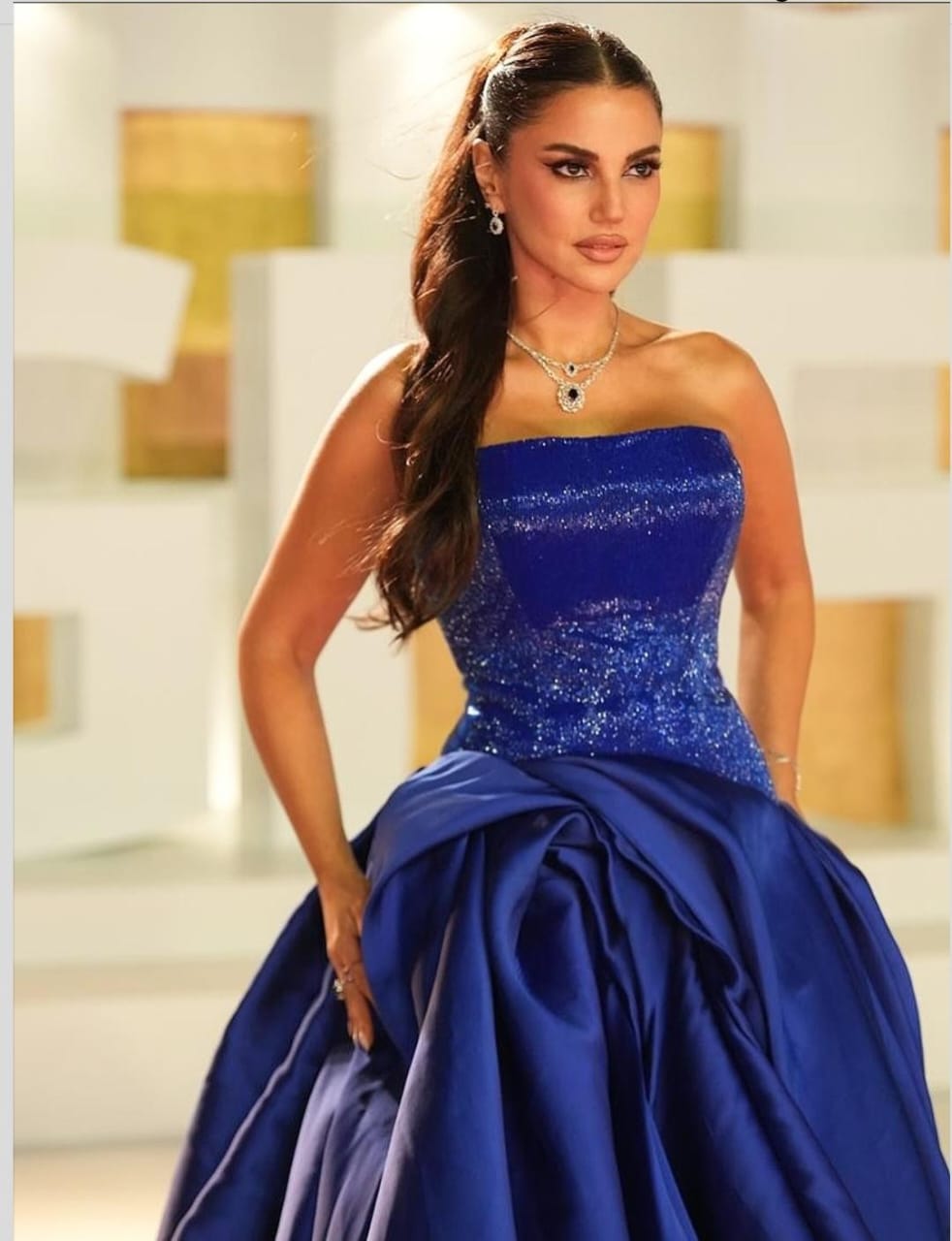 طلالة كلاسكية عصرية من توقيع دار الأزياء صوفي بدبي (saphie couture) باللون الأزرق الملكي المصنوع من قماش الستان الامع مكشوف الصدر بقصة الكورساج المنحو ت مطرز يدويا بالخرز الامع بنفس لون الفستان اعطي رئية بصرية مريحة للعين.