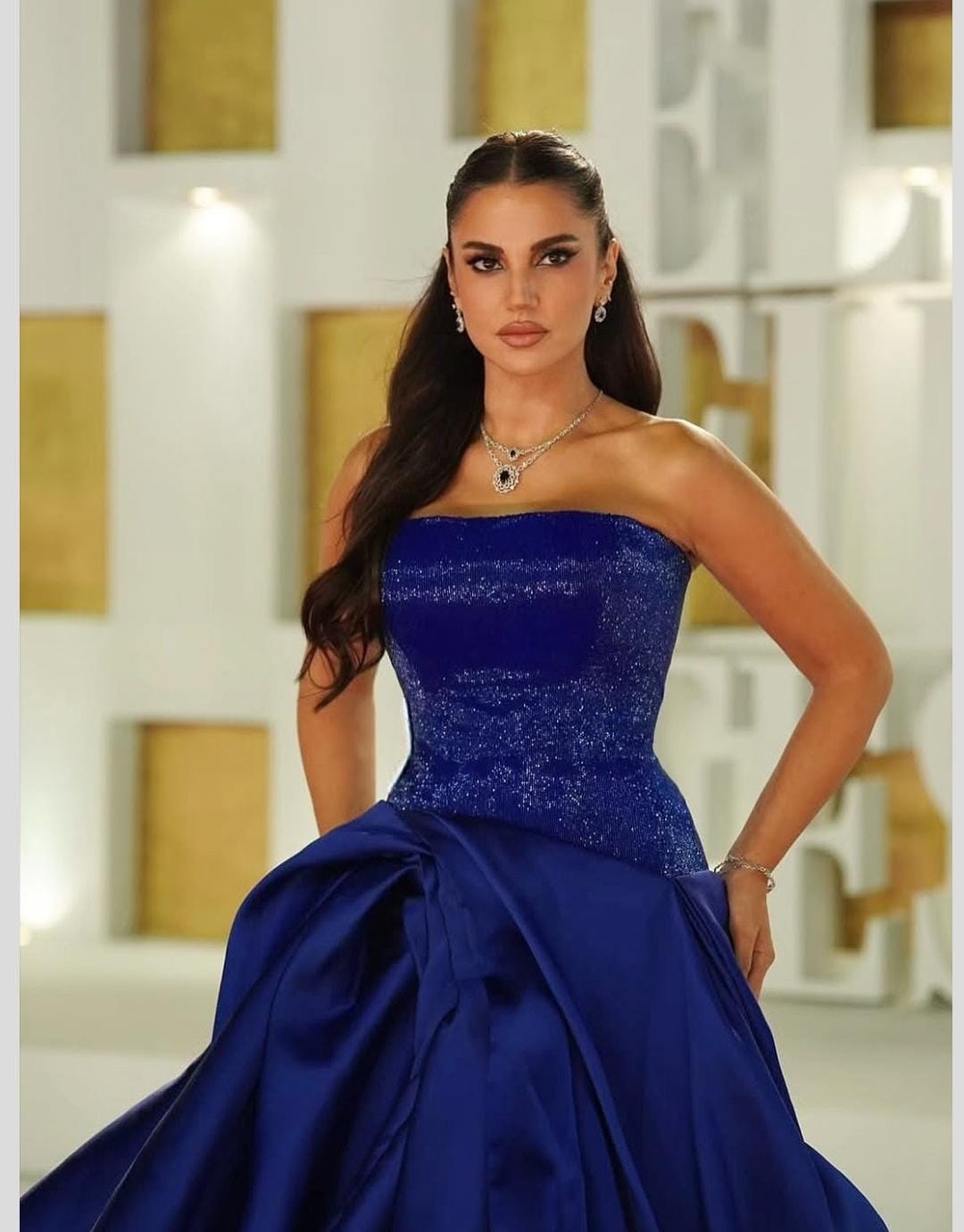 طلالة كلاسكية عصرية من توقيع دار الأزياء صوفي بدبي (saphie couture) باللون الأزرق الملكي المصنوع من قماش الستان الامع مكشوف الصدر بقصة الكورساج المنحو ت مطرز يدويا بالخرز الامع بنفس لون الفستان اعطي رئية بصرية مريحة للعين.